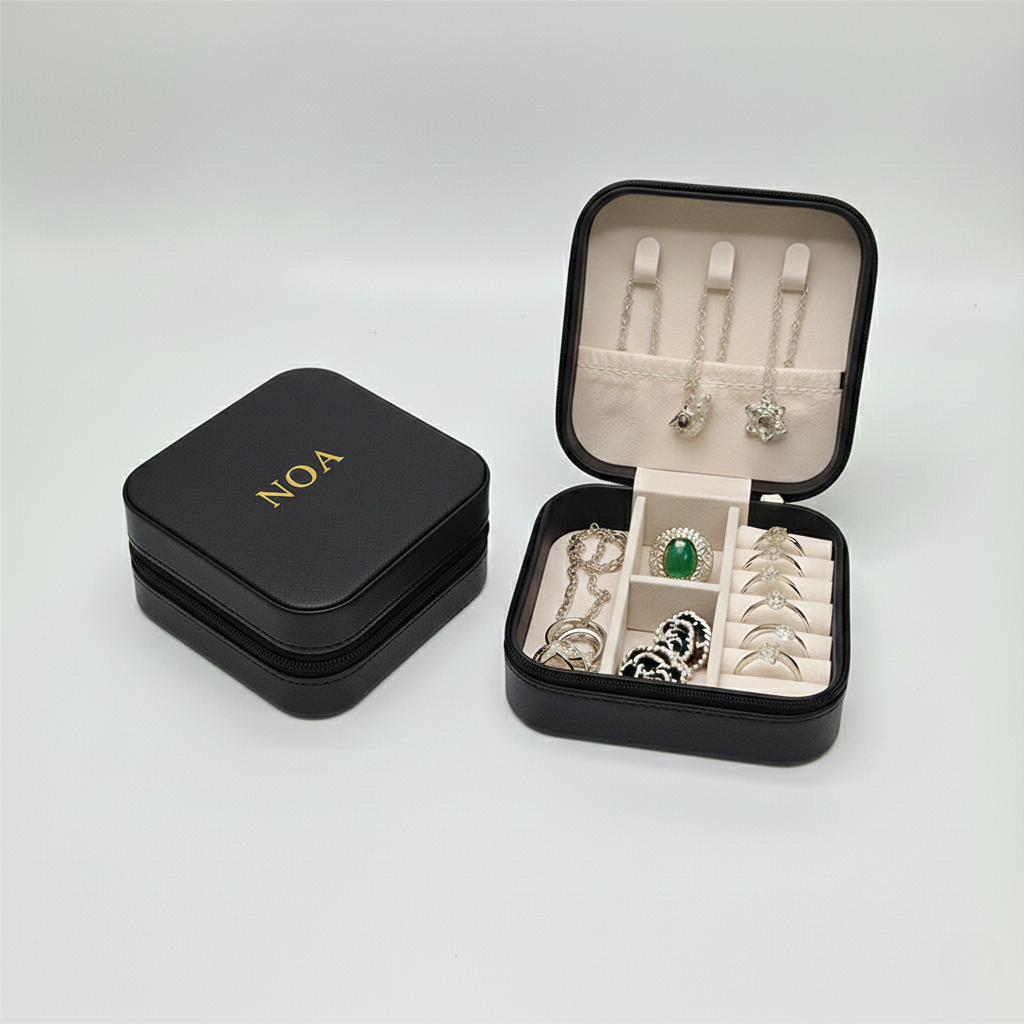 תיק התכשיטים היוקרתי שלנו מגיע עם חריטת שם אישית ומעניק שילוב מושלם בין עיצוב אלגנטי לפרקטיות יומיומית. זהו תיק קומפקטי, איכותי ומעוצב בקפידה, שמתאים לאחסון תכשיטים בבית וגם לנסיעות.